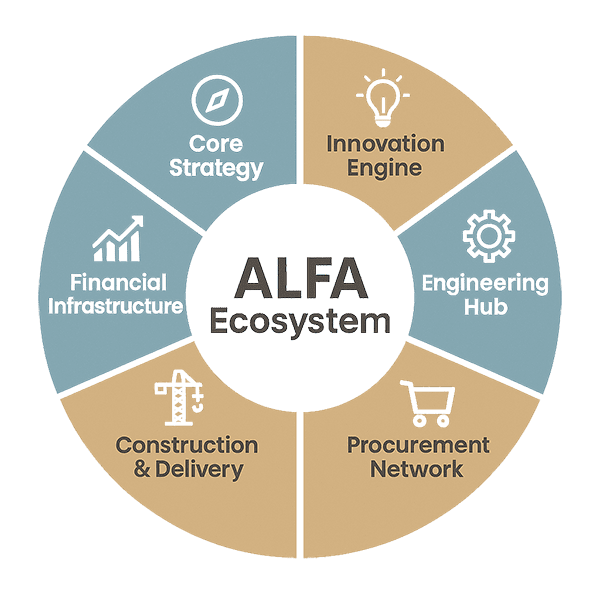 ALFA is the nexu of strategy, engineering, construction, and finance—where every project is not only built but redefined in purpose and trajectory. The R.E.P.C.F model represents a complete cycle of project transformation, from concept to execution and intelligent investment.